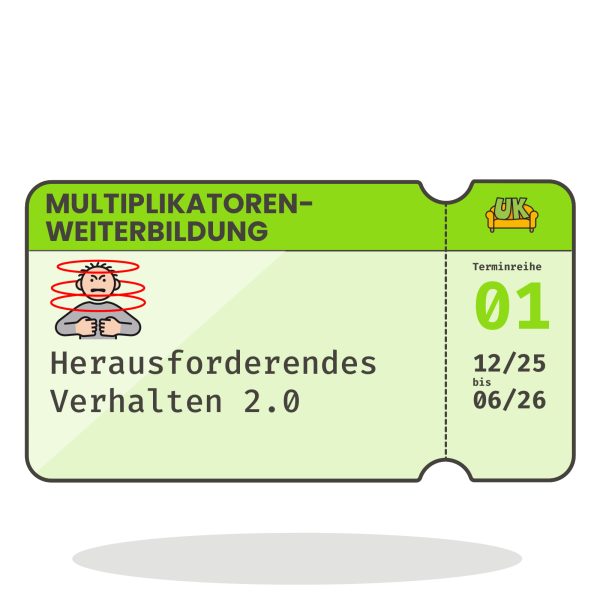 Dieser Kauf reserviert einen Platz in der Multiplikatoren-Weiterbildung „Umgang mit herausforderndem Verhalten”. Es gelten die Allgemeinen Geschäftsbedingungen für Weiterbildungen. Alle wichtigen Informationen zu der Weiterbildung können hier nachgelesen werden.