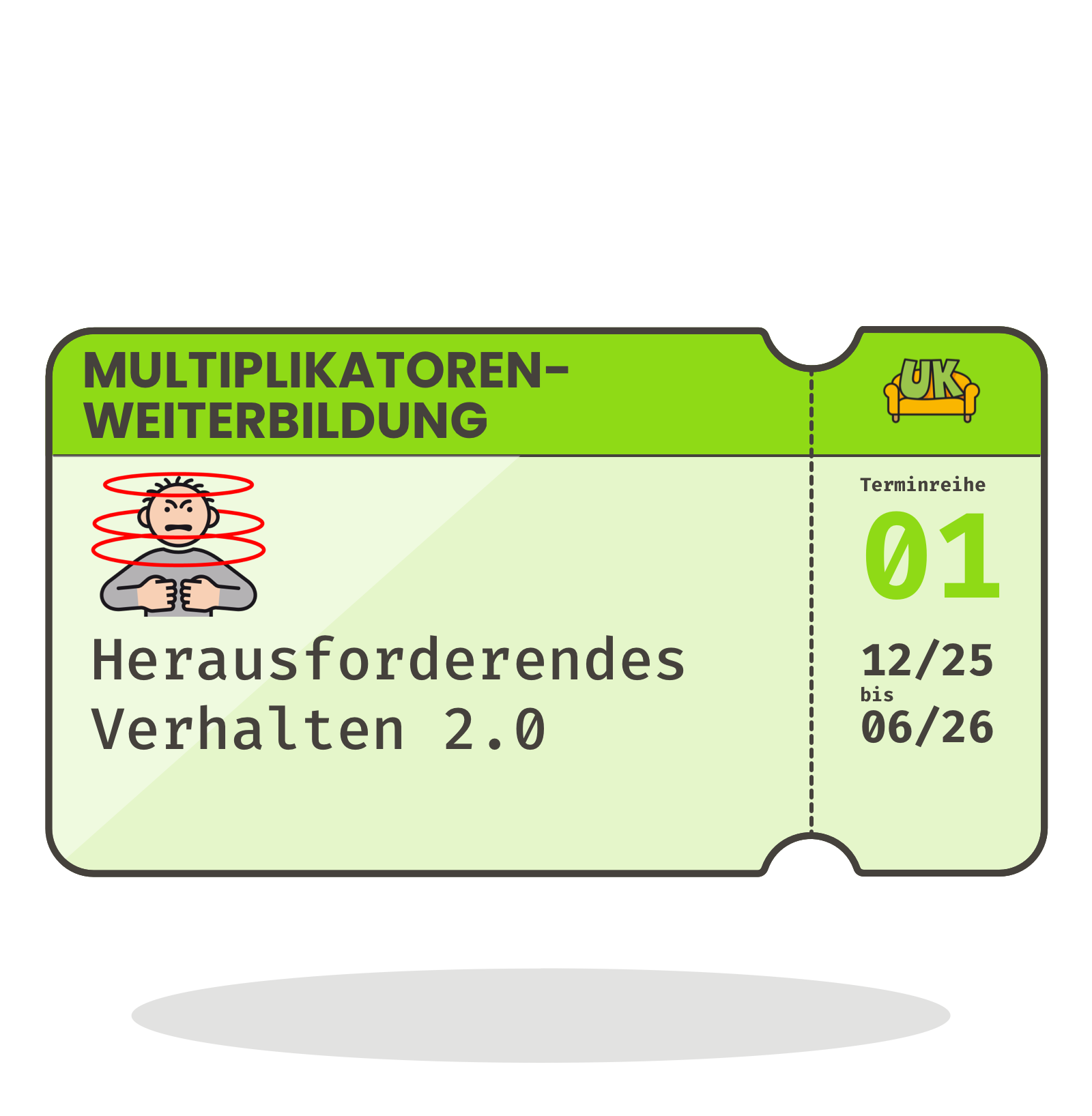 Dieser Kauf reserviert einen Platz in der Multiplikatoren-Weiterbildung „Umgang mit herausforderndem Verhalten”. Es gelten die Allgemeinen Geschäftsbedingungen für Weiterbildungen.  Alle wichtigen Informationen zu der Weiterbildung können hier nachgelesen werden.